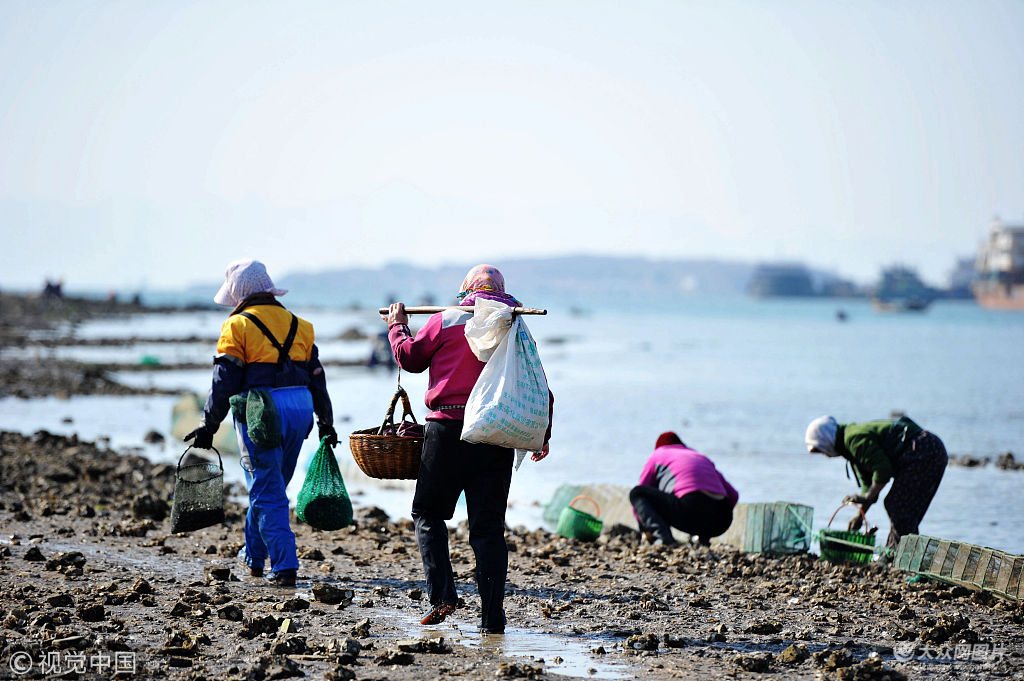 2018年11月22日,青島。當日是二十四節氣“小雪”,又恰逢農歷10月15,天文大潮。在山東青島西海岸新區唐島灣南岸,眾多市民趁落大潮前來灣底趕海挖拾牡蠣、蛤蜊,撿拾八帶鮹、螃蟹等小海鮮,有些市民還蹚過海水到深海處挖拾海鮮,帶著滿滿的收獲回家。濃郁的漁家趕海風情與對岸現代化城區形成獨特的風景,吸引了不少游客前來觀看并加入到趕海的行列中。