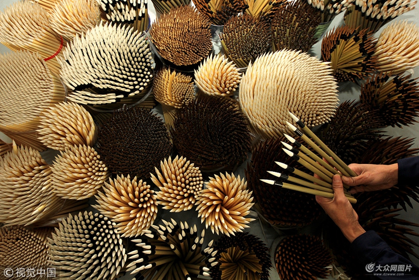 2018年11月25日,在山東省棗莊市陰平鎮(zhèn),技術(shù)人員在檢查毛筆質(zhì)量。