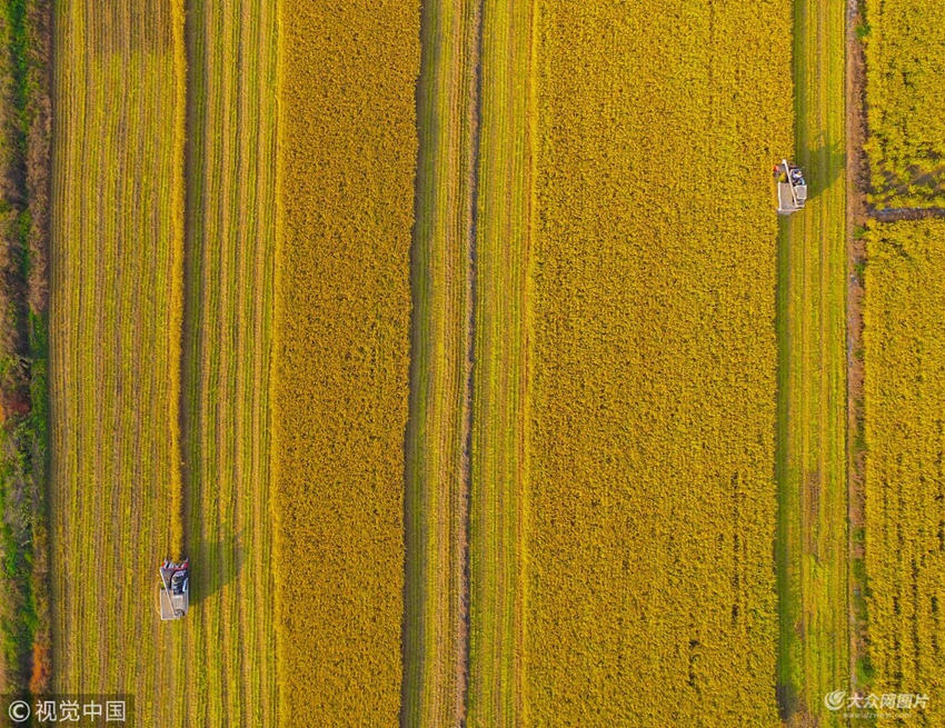 2018年10月5日,秋收時(shí)節(jié),大地金黃。航拍山東濟(jì)南市西郊吳家堡街道辦事處七里鋪村種植的上萬(wàn)畝水稻進(jìn)入豐收季節(jié),田間水稻機(jī)械化收割的場(chǎng)景,十分壯觀,宛如大地畫(huà)作。