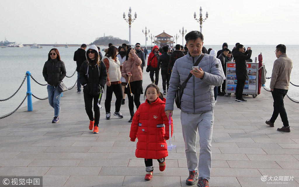 2018年12月4日,游人著冬裝在青島棧橋海濱游玩。