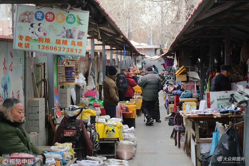 2019年1月9日,山東濟南英雄山北側(cè)市場內(nèi)聚集很多人,白色泡沫箱子上面蓋著透明的玻璃,箱子內(nèi)整齊擺放著形狀各異的瓶瓶罐罐,里面裝著蟈蟈。