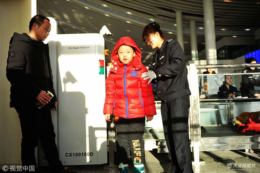 2019年1月21日,山東青島西站, 一位小朋友在接受安檢。