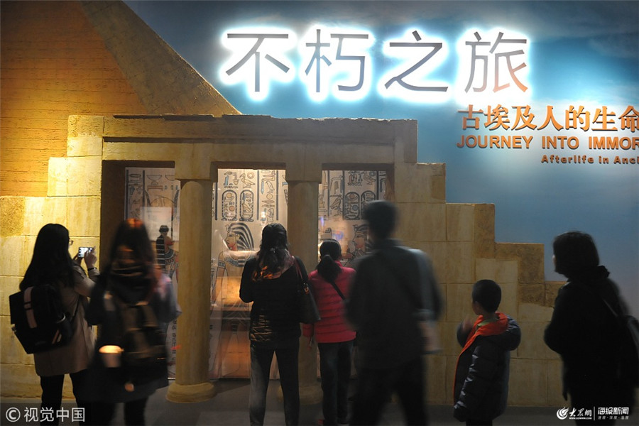 2019年3月31日,山東省濟南市,山東博物館“不朽之旅——古埃及人的生命觀”展覽第一天。展覽圍繞古埃及人永生的生死觀念,精心遴選來自意大利佛羅倫薩國立考古博物館的100件(套)古埃及珍貴文物,通過于莎草紙、石棺、雕像等多種載體之上的圖案、象形文字以及豐富多樣的隨葬品的解讀,輔以古埃及人的神話傳說、文化符號等,揭開古埃及人永生生命觀念的神秘面紗,進(jìn)而窺探古埃及人的社會生活及其精神信仰世界。