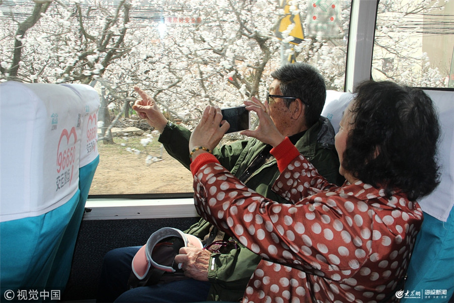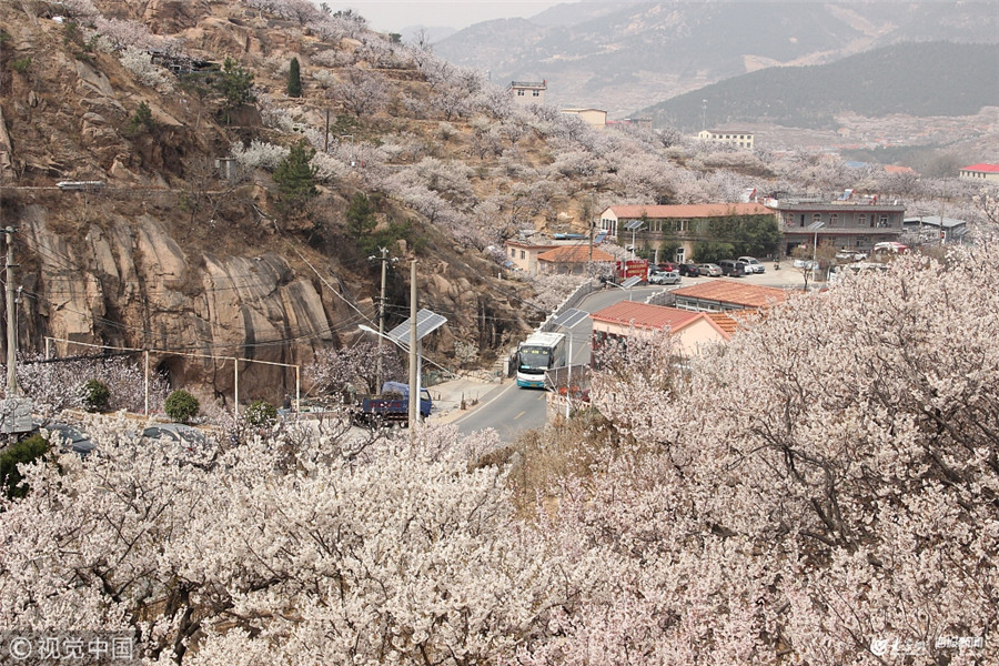 2019年3月29日,青島嶗山北宅櫻桃花陸續開放,一輛溫馨巴士正駛過我樂村櫻桃花海。