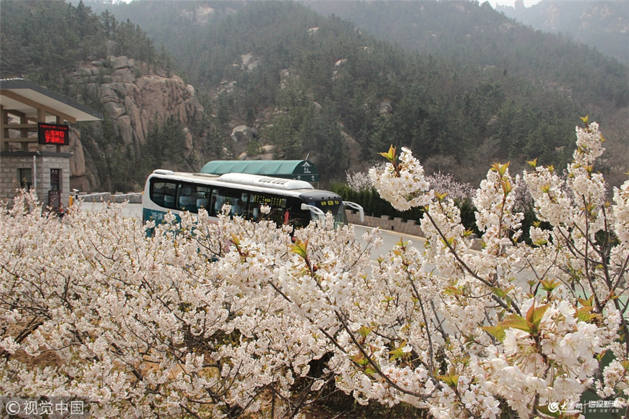 每到3月底4月初,嶗山都會有一趟開往春天的巴士,這條交運溫馨巴士639路公交線路穿行在漫山遍野的花海中,成為名副其實的“開往春天的巴士”。交運溫馨巴士639路公交線路是唯一一條進入嶗山北九水景區的公交車線路,從周哥莊發往觀嶗停車場,沿途經過16個站點,站站有景點,是一條名副其實的旅游公交線路。從周哥莊始發站開始,現在沿途櫻桃花盛開;不過有的山坡朝陽,除了花開以外,已經長出不少綠色的嫩葉,點綴在花海中顯得格外好看;山坡還有不少杏花和桃花也已經開放,粉紅色的桃花點綴在其中也非常好看。 從臥龍公交站開始正式進入景區,路的兩旁的山坡上數千株櫻桃開著粉白色的花扮靚山谷兩邊。市民游客如果從小路爬到周邊的山坡上往下看,那櫻桃花海美得令人流連忘返。