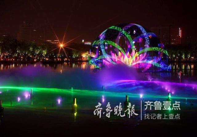 水幕呈現出濟南第三大名泉——珍珠泉,岸邊楊柳輕垂,泉水清澈如碧,一串串白色氣泡自池底冒出,仿佛飄灑萬顆珍珠,迷離動人。