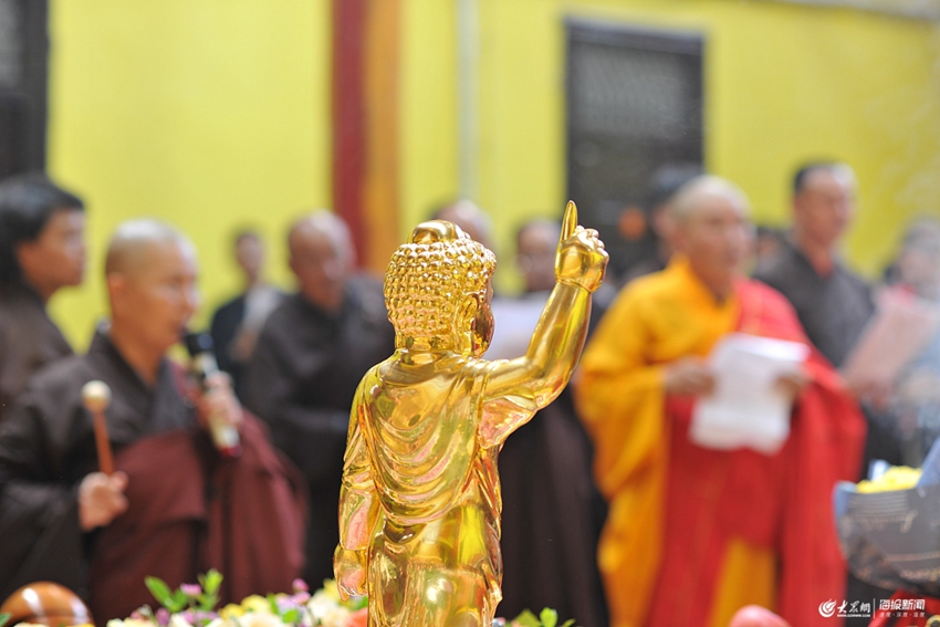 2019年5月12日,山東濟寧,鄒城晚照寺舉辦浴佛節(jié)法會,眾多市民參與誦經(jīng)、撞鐘、放生的活動。