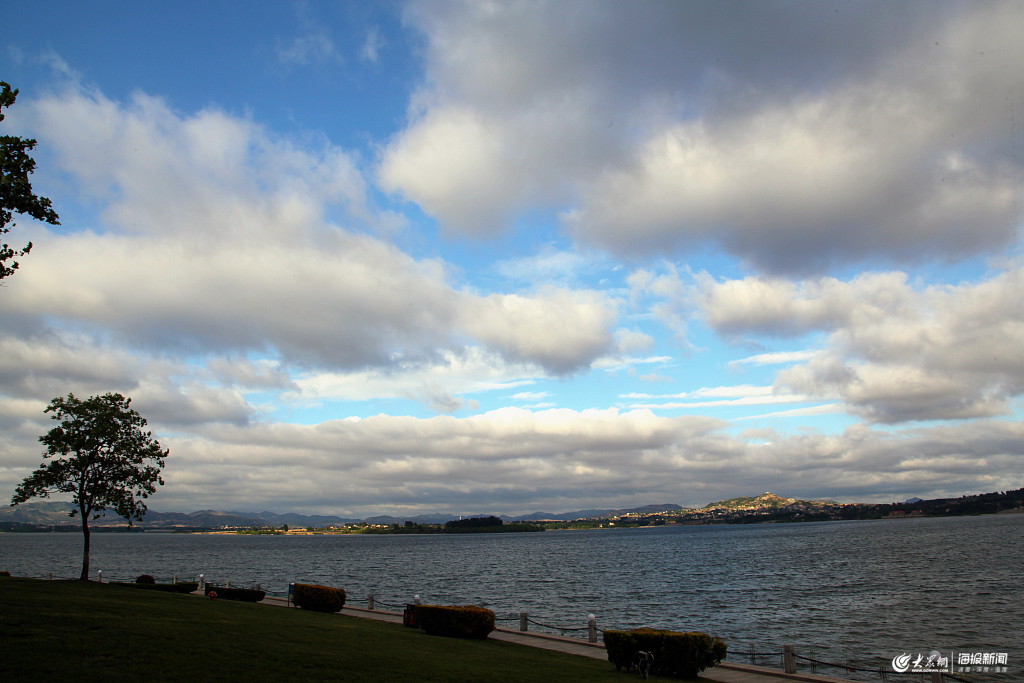 2019年5月17日,山東泰安迎來藍天白云晴好天氣,青云湖風景如畫美不勝收。