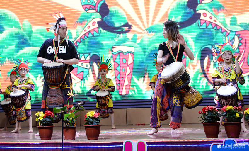 2019年5月30日,山東聊城,來自南美洲厄瓜多爾的國際友人Alex先生(中文名:陸靖熙),在茌平縣翰林幼兒園迎六一文藝演出上,與30名幼兒10名教師一起拍起了非洲鼓、跳起了非洲舞《愛的節拍》,在舞臺上Alex先生用一口流利的漢語,恭祝小朋友節日快樂。
