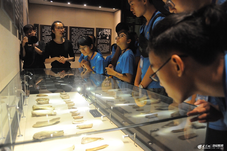 2019年7月9日,山東煙臺,華裔青少年在福山區王懿榮紀念館了解甲骨片。圖片作者:鳳尾竹/視覺中國