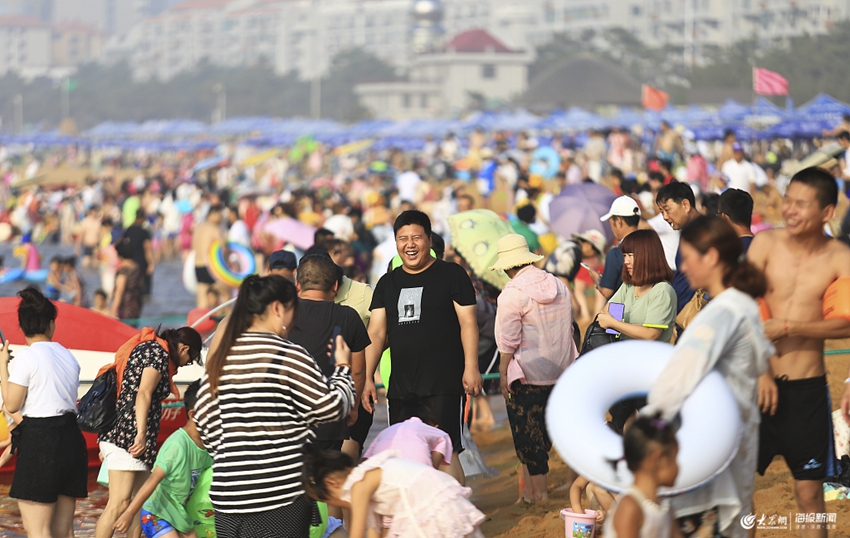 2019年7月14日,山東威海國際海水浴場,數以千計的游客在海邊避暑,盡享清涼,一年一度的海邊“下餃子”模式再次開啟。