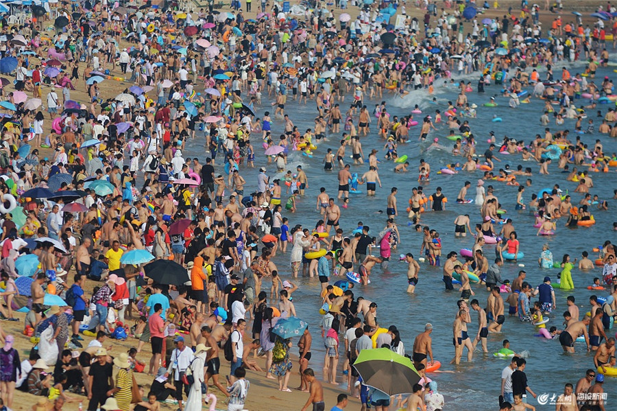 2019年7月21日,山東青島開啟“燒烤模式”,眾多游客來到海邊戲水納涼,第一海水浴場游客爆滿。