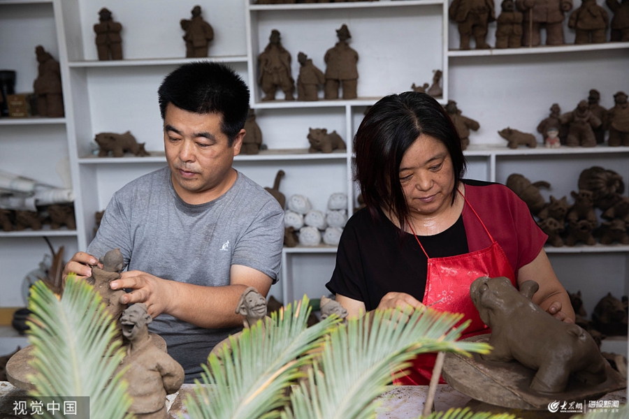 2019年7月28日,山東青島,家住平度市大十里堡村的高杰和王小妮詩當地知名的民間藝人,其泥塑作品擅長表現農村題材的“鄉土故事”,手法夸張有度,生動有趣,屢屢獲獎。高杰和王小妮還好捏十二生肖,并對捏泥豬最為喜歡,他們在生肖豬的形態基礎上,不斷摸索、實踐,最終巧妙創作出了這些不同造型、極具藝術價值的泥塑小豬。隨著技藝獲得了社會認可,他們的泥塑作品在市場上熱銷,并屢屢走出國門,一只泥豬的市場售價甚至會賽過真豬。