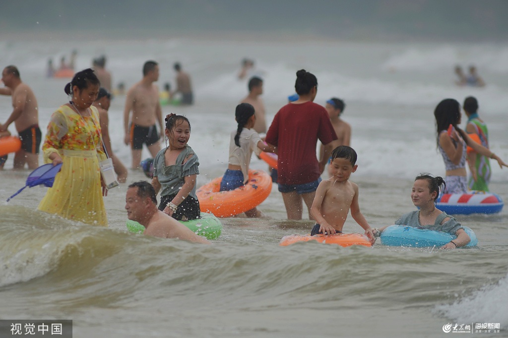 2019年7月30日,游客在青島市嶗山區(qū)石老人海水浴場游玩拍照。