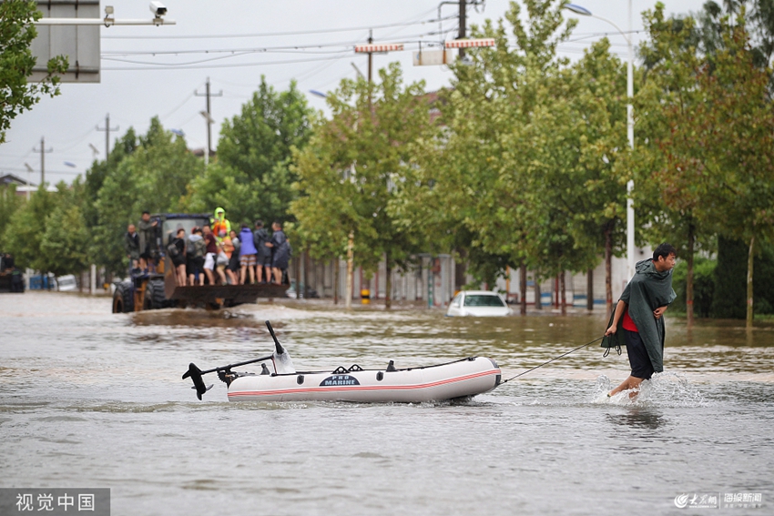 2019年8月12日,濟南,受臺風“利奇馬”影響,章丘區部分村莊積水嚴重。東皋西村受災最嚴重地區水深超過1米,部分地區水深達3-4米。當地部門緊急調派鏟車和直升機,對受困群眾進行轉移。