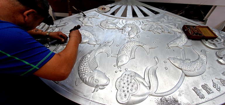 今年56歲的尚紅生其祖上以刻銅為生,其家傳純手工刻銅工藝傳至他已經(jīng)有800余年的歷史,作為非物質(zhì)文化傳承人的尚紅生在繼承祖上雕刻“絕活”的基礎(chǔ)上,不斷創(chuàng)新生活,自己設(shè)計(jì)繪制樣稿,內(nèi)容以歌頌祖國,贊美新時(shí)代為主題,然后手工在鋁鎂合金板材上雕刻,制作成精美藝術(shù)品,令人驚嘆不已。