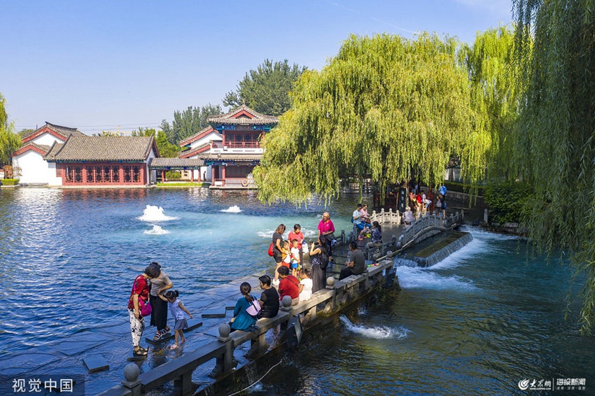 2019年8月22日,濟南,章丘區百脈泉景區,降雨過后,百脈泉水位超過63.40米,百脈泉、梅花泉、漱玉泉、墨泉、眼明泉等泉水噴涌勁頭十足,游客和市民暢游其中。空中俯瞰百脈泉噴涌,亭臺樓閣綠樹環繞,景色如畫似江南。