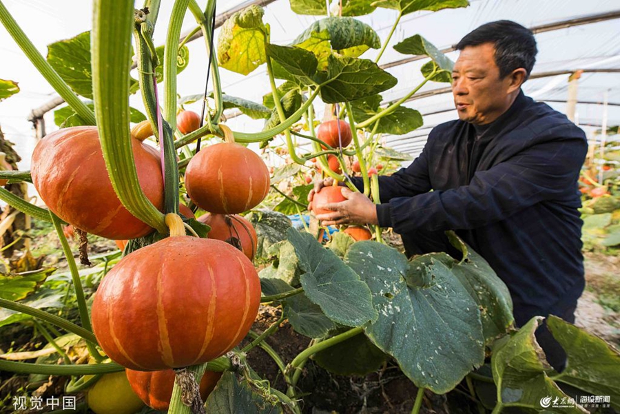7日,山東省濰坊青州市東夏鎮(zhèn)薛廟村農(nóng)民在查看紅南瓜長(zhǎng)勢(shì)。