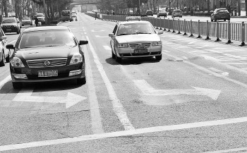 “兩排左轉(zhuǎn)車道了,肯定通過的多啊。”出租車司機(jī)王師傅告訴記者,這一路口向左是濼源大街,西向有不少單位,所以早高峰時(shí)段左轉(zhuǎn)車輛很多,“正常左轉(zhuǎn)一般需要等待三個(gè)信號(hào)燈,如果碰上‘加塞兒’的,或者頭車啟動(dòng)慢,那就更麻煩了。”