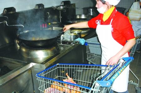 接到舉報后,市工商局執法局一處處長唐川當即帶隊前往楊家坪九龍廣場沃爾瑪超市實地調查,發現市民舉報屬實。唐川告訴記者,他趕到沃爾瑪超市熟食品加工區后發現,一名女員工正在用油炸的方式加工“樟茶板鴨”。在她身邊的垃圾箱旁,已堆放了一大堆板鴨的外包裝袋。據了解,這些包裝袋里的板鴨正是加工“樟茶板鴨”的原材料。唐川察看發現,這些包裝袋上顯示板鴨的出廠日期為2011年1月26日,保質期:“未開袋10天,開袋后24小時。”這意味著,這些作為“樟茶板鴨”原材料的袋裝板鴨早已過期。