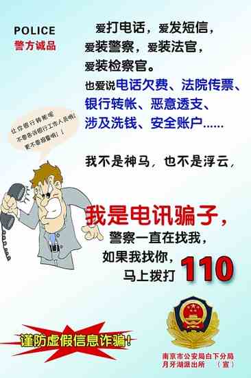 愛打電話,愛發短信,愛裝警察,愛裝法官,愛裝檢察官。也愛說電話欠費、法院傳票、銀行轉賬、惡意透支、涉及洗錢、安全賬戶……我不是神馬,也不是浮云,我是電訊騙子,警察一直在找我,如果我找你,馬上撥打110……