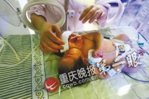 “現在試著喂點糖水,看寶寶能不能適應。”護士介紹,由于兩個頭挨得很緊,加上食道畸形,根本不敢喂奶,否則會發生窒息等意外。因此,雙頭嬰從出生到現在都是通過輸液維持生命。但昨天專家組決定,可以試探性地喂幾滴糖水,再根據寶寶的基本狀況作下一步打算。
