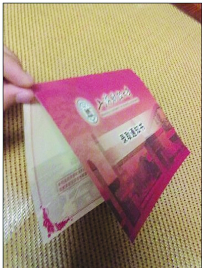 至于復(fù)旦大學(xué)今年通知書的背面,很精致,洋溢著藝術(shù)氣息。通知書的左側(cè),有枚別致的“百年學(xué)府”印章,它是由12層納米防偽圖層組成,在識(shí)別器燈光的照耀下,在不同的角度可以顯現(xiàn)四種不同的圖案。紅色的錄取通知書表面,一輪旭日下一隊(duì)大雁結(jié)隊(duì)飛翔,配合“復(fù)旦大學(xué),一個(gè)世紀(jì)來中國才俊的選擇”的文字,多了幾分靈性和藝術(shù)色彩。“這是復(fù)旦大學(xué)應(yīng)該有的霸氣和自信。”姜暢告訴記者。