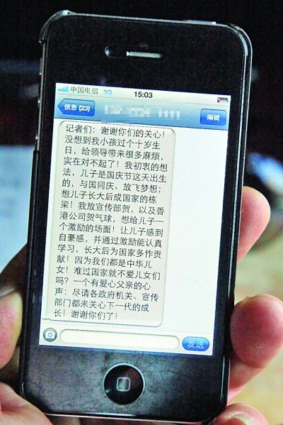 記者得到了董啟陽給宣傳部的道歉短信,內容是:兒子過生日,請中天廣告公司放四只氣球,我當時腦子很簡單,總是想在親戚朋友面前擺譜,冒用宣傳部來祝賀,沒有想到給領導帶來這么多的麻煩,實在對不起,請求原諒。我愿意接受法律的制裁,都是我的錯,一切為了孩子,請領導原諒,給我一個機會,過幾天回家去宣傳部請罪。短信的末尾這樣寫道:“請原諒一個50歲男人對兒子的關愛!”
