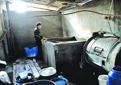 但是記者經觀察發現,作坊外間有一個鍋爐和兩個蓄水池,其中一個蓄水池內的水顯然已成乳黃色,但仍在循環使用。內間一臺洗衣機,工人將洗好的桌布疊起來放在一邊,有的甚至直接放到地上。見記者采訪,之前搬運桌布的男子稱他是洗滌作坊的老板,作坊的運營是有營業許可證的。他說:“我們這是小本經營,一個月從一家飯店只能賺到2000—3000元,我又是老板又是搬運工,賺的都是辛苦錢,你不要給我們曝光。”作坊老板稱,洗衣排出的污水,他會定期用抽水泵抽走,堆在屋內的木材都是拿來燒熱水的。當然,老板還告訴記者,他們與該酒樓合作搶了別人不少生意,畢竟市場競爭,價格是絕對優勢。經常接到舉報也是不足為奇,自己賺得都是辛苦錢,沒什么好怕的。當然場地設備有限,環境問題確實有些……老板欲言又止顯得有些無奈。還說等賺了錢,他們一定會改善,老板拍著胸口向記者保證。