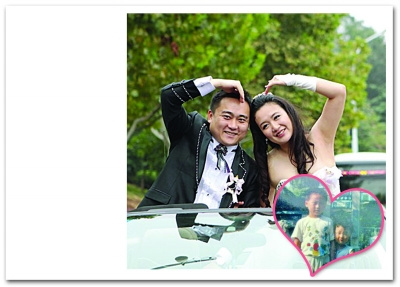 大圖:婚禮當天兩人大秀恩愛。小圖:20年前的兩個人。