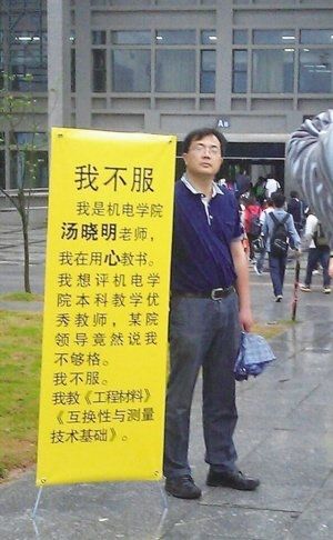 記者 陳偉斌 核實報道 昨天上午,這則消息出現在網絡上后,即引發了網友們的熱議。記者從網友上傳的現場圖片中看到,主人公是一名左手持傘、右手扶著一易拉寶的青年男子。以 黃色為底色的易拉寶最上方,赫然寫著“我不服”三個大字,其后則是這位教師對自己的介紹和對此舉的解釋:“我是機電學院湯曉明老師,我在用心教書,我想評機電學院本科教學優秀教師,某院領導竟然說我不配。我不服!”