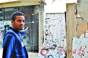 蘇爾特居民法西姆介紹自己家后院的受損情況。