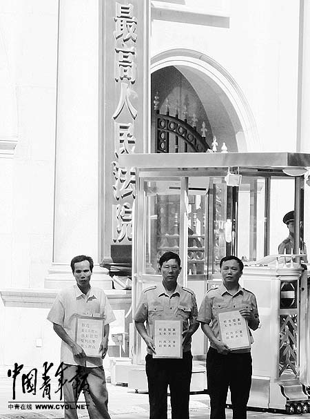 2011年9月8日,符亞紅(左)、開槍民警文瑞強(中)、派出所原所長章生貴在京反映情況。本報記者 劉萬永攝