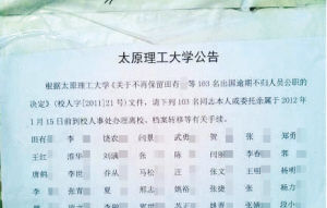 公告稱:根據太原理工大學《關于不再保留田X亮等103名出國逾期不歸人員公職的決定》(校人字[2011]21號)文件,請下列103名同志本人或委托親屬于2012年1月15日前到校人事處辦理離校、檔案轉移等有關手續。公告同時列出了103人詳細名單。