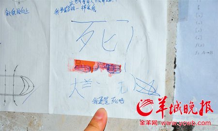 在邱燦松居住的狹窄的小閣樓里, 墻上貼的紙條上,用圓珠筆寫著一個大大的“死”字,桌子上堆滿了復習備考的課本,在作業本的空白處,不時出現表露悲觀情緒的語句, 還有一張紙上涂鴉般地寫著:“從娘胎中到小學畢業,我的生活很不平。”記者從紛亂的作業本里, 翻出一段類似心情感悟的話:“我半年來過著行尸走肉的生活,我沒想過未來,很想自殺……”