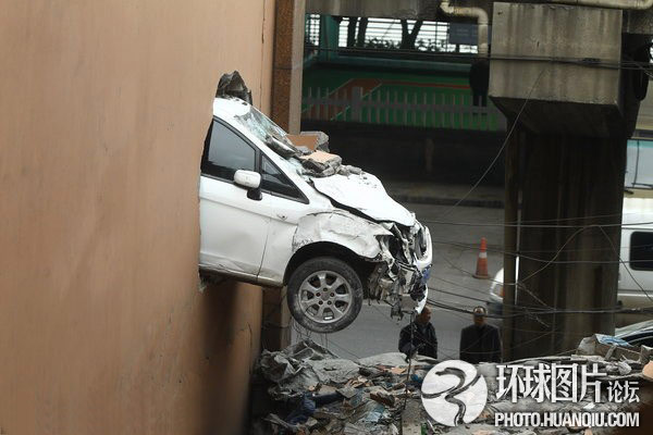 重慶上演特技級車禍 轎車撞破墻壁懸掛半空中
