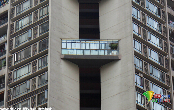 2015年5月24日,重慶渝北區(qū)一住宅小區(qū)的21-22層之間的懸空露天陽(yáng)臺(tái)被業(yè)主私自改建成了房屋,房屋用玻璃和鋼材搭建,形成一間異形房屋,約6平方案,離地約66米,被市民稱(chēng)為“最牛空中違建”。