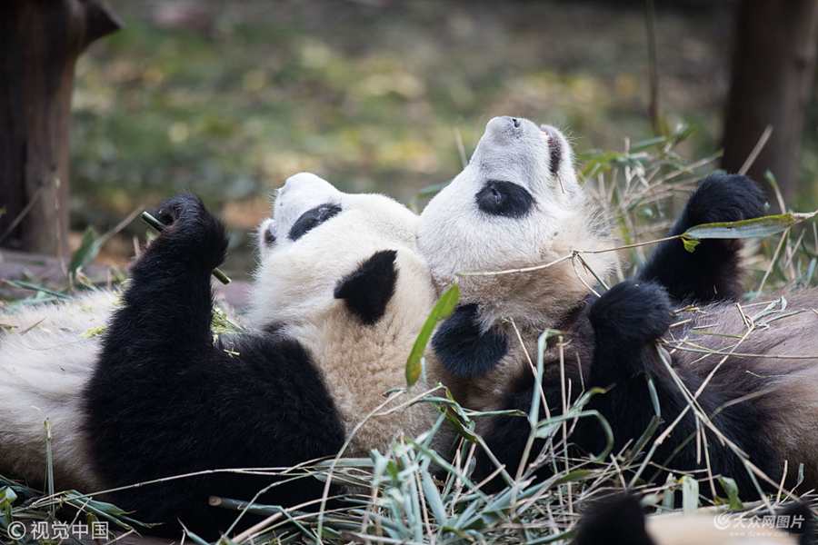 成都:兩只大熊貓頭靠頭吃竹子“秀恩愛(ài)” (/)