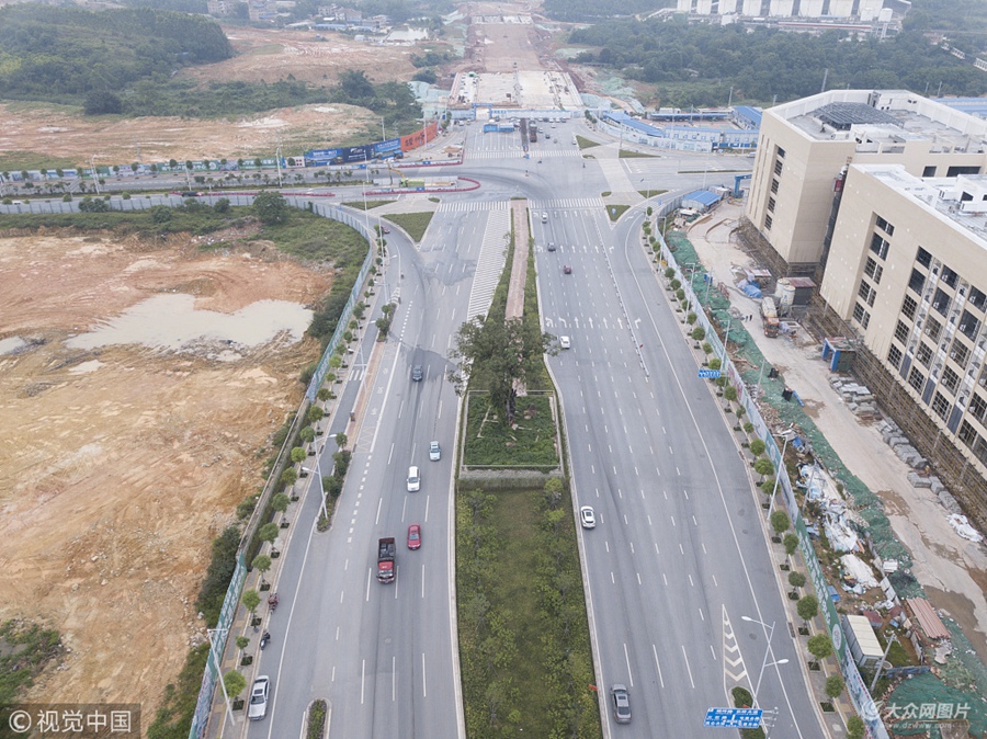 2018年5月8日,廣西南寧。在南寧市長虹路往松柏路方向,有一棵“扁桃王”屹立在道路中間,原本寬廣的道路至此變窄。