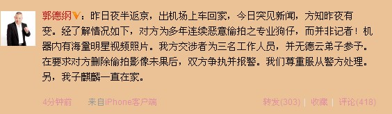 1月9日晚,郭德綱率德云社十余人從外地演出后返京,在首都機場T3航班樓發現“風行工作室”攝影師拍攝后,與其發生沖突。郭德綱八個弟子群毆攝影和司機兩人近20分鐘,而郭德綱則在一旁觀看。直到警察來到現場,攝影才被送往醫院接受治療,司機則被揪掉了一縷頭發,精神恍惚。今日(10日)郭德綱發微博對此事進行了回應,稱對方并非記者實為專業狗仔,并且說德云社弟子并未參與斗毆。其子郭麒麟也一直在家中。