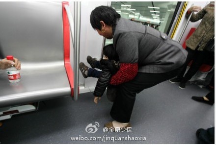 網友“瑪兒姐姐”向微博記者@金泉少俠介紹說,“這紅衣服的小盆友,在新開的杭州地鐵上小便。她多次勸說這位家長到站后給小孩去站內衛生間上廁所。但家長振振有詞地說:小孩要拉就要拉的。隨后,便拉下小孩子的褲子就在地鐵門邊拉了,現在,地鐵車廂里一股尿騷味。這素質!”