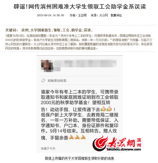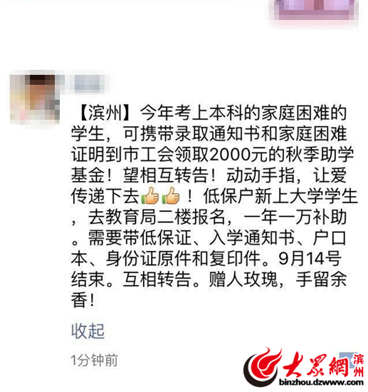 網(wǎng)絡(luò)上流傳的消息寫到:“濱州今年考上本科的家庭困難的學(xué)生,可攜帶錄取通知書和家庭困難證明到市工會領(lǐng)取2000元的秋季助學(xué)金。低保戶大學(xué)新生可到教育局二樓報名,領(lǐng)取一年一萬元補助。需要帶低保證、入學(xué)通知書、戶口本、身份證原件和復(fù)印件,9月14號結(jié)束。互相轉(zhuǎn)告。”