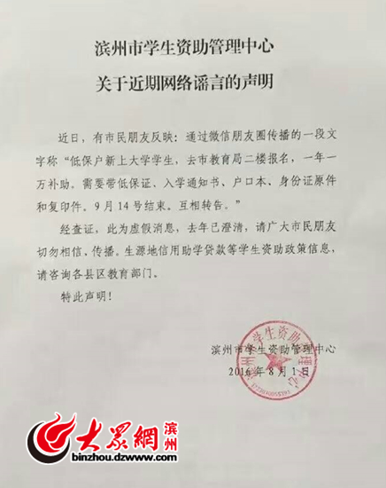 濱州市學(xué)生資助管理中心官方辟謠聲明
