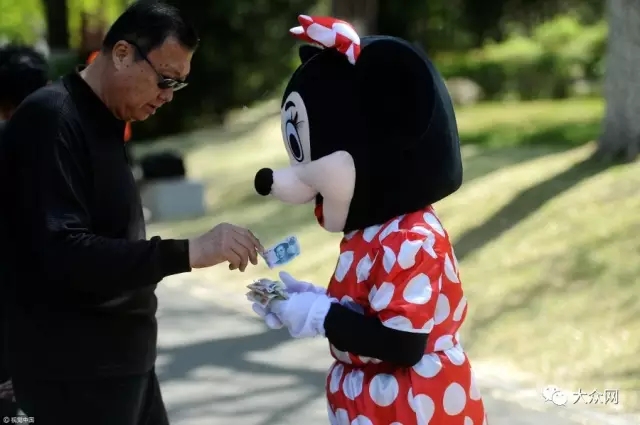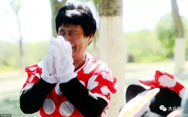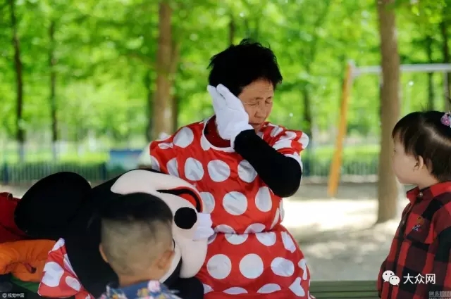 為了讓兒媳婦得到更好的治療,銀丕芝決定干些力所能及的活,幫她籌款治病。正好兒子有朋友是搞演出活動的,她便借來這身衣服,去跟人合影籌款。最近隨著濟南的溫度逐漸升高,老人開始感覺有些吃力了。開始的時候,銀丕芝還能勉強應付,當有孩子跑到她身邊要求照相時,她還能蹲下身子,跟他們聊幾句。但很快,她就會大汗淋漓,有些吃不消了。每當這時她就坐在附近休息一會兒,感覺沒問題了,套上頭套繼續表演。她說希望自己能夠堅持下去,希望能夠多籌些錢,用以支撐這個傾斜的家庭。