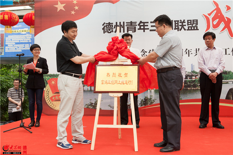 德州經(jīng)濟(jì)技術(shù)開發(fā)區(qū)黨工委委員、管委會副主任岳紅星和富士康科技集團(tuán)經(jīng)理肖永輝為富鴻三創(chuàng)網(wǎng)上線運(yùn)營揭牌。(撒偉 攝)