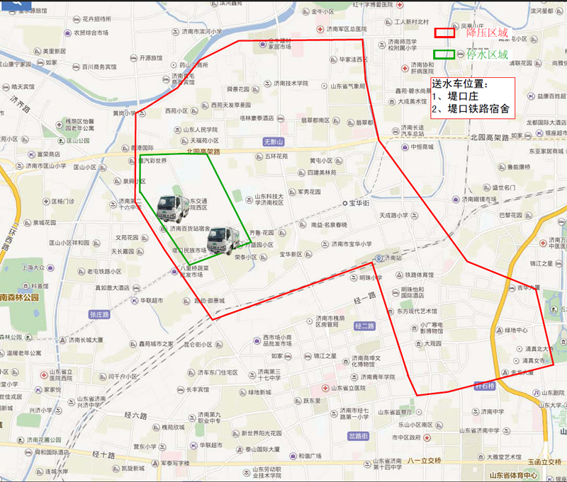 停水區(qū)域包括:堤口莊南路、礦院路、勝利莊路沿線、天橋區(qū)政府及西鄰的七天酒店、金德利民快餐、堤口莊、勝利莊、堤口鐵路宿舍等。