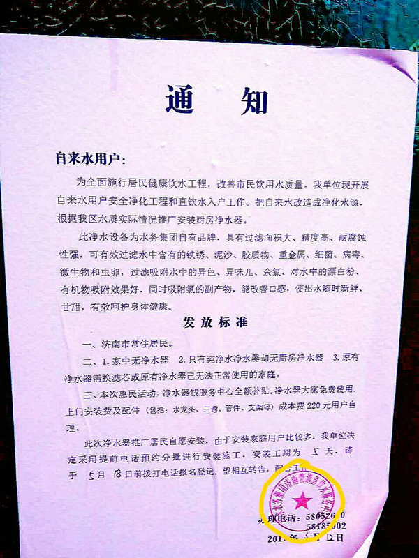 13日,記者見到了張貼在部分小區(qū)內(nèi)的這個“通知”。“通知”顯示:我單位現(xiàn)開展自來水用戶安全凈化工程和直飲水入戶工作。把自來水改造成凈化水源,根據(jù)我區(qū)水質(zhì)實際情況推廣安裝廚房凈水器。此凈水設(shè)備為水務(wù)集團自有品牌……本次惠民活動,凈水器錢服務(wù)中心全額補貼,凈水器大家免費試用,上門安裝費及配件成本費220元用戶自理……
