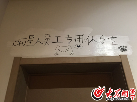 店里的裝修都是張廣橋自己設計的,一些細節也突出了他對于喵星人的細心照顧。在咖啡館三樓,有一個寫著“喵星人休息室”的地方,門的下方特意開了一道“貓門”方便進出。“我家這幫小家伙都是按時驅蟲,店內也是每天驅味消毒,而且都打了防疫針,絕大部分進行了絕育,以防止他們有生殖系統的疾病。”張廣橋說,現在店內每天會有十只左右的貓咪,另外的貓咪就在家里玩,實行一周換一輪,讓它們能夠得到充分休息。他滿懷信心地說,“我希望以后能夠養到三十只貓,然后聚集更多的愛貓人,讓濟寧這家貓咖變得越來越好!”