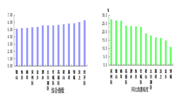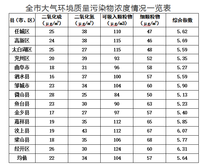 二氧化氮濃度最好的縣(市、區(qū))是微山縣,為25微克/立方米;最差的縣(市、區(qū))是汶上縣,均為43微克/立方米;同比改善幅度最大的縣(市、區(qū))是曲阜市,為27.9%,同比惡化幅度最大的縣(市、區(qū))是泗水縣,為5.7%。