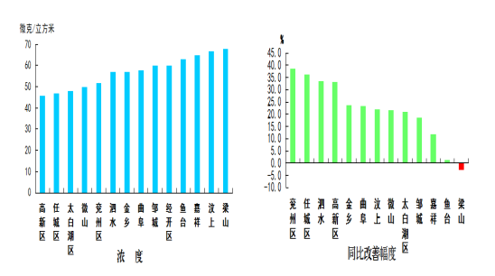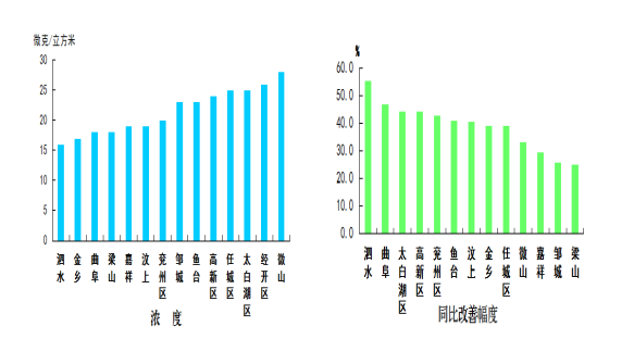 此外,細(xì)顆粒物濃度最好的縣(市、區(qū))是高新區(qū),為46微克/立方米;最差的縣(市、區(qū))是梁山縣,為68微克/立方米;同比改善幅度最大的縣(市、區(qū))是兗州區(qū),為38.8%,僅梁山縣同比惡化,為3.0%。